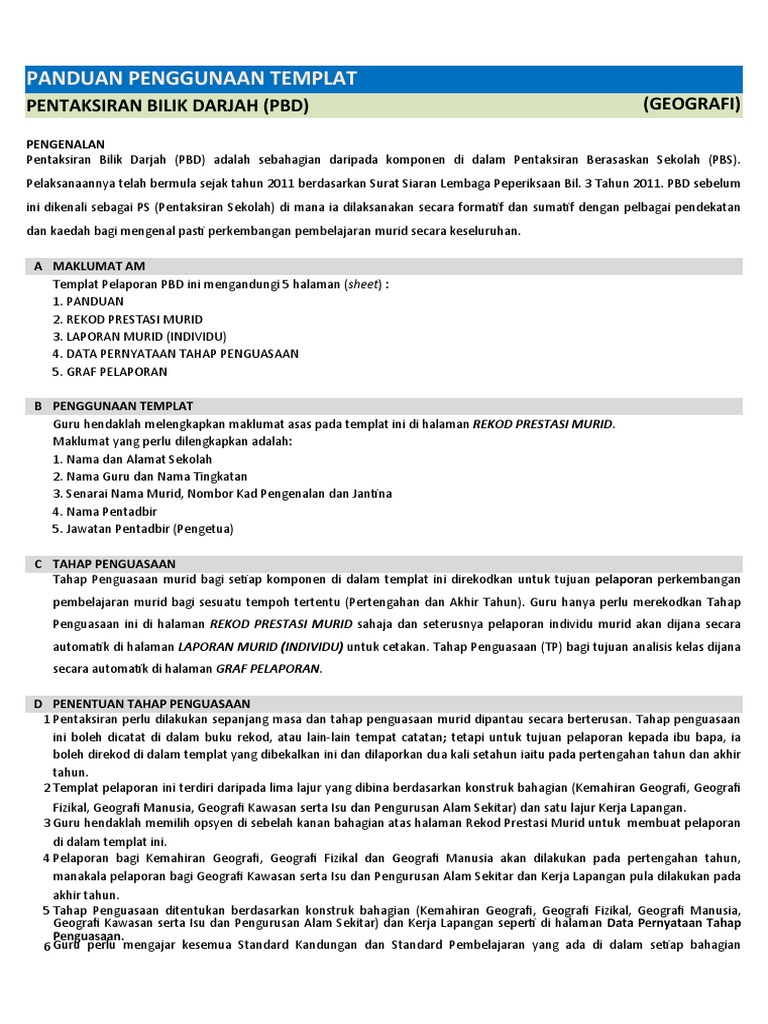 A MAKLUMAT AM Templat Pelaporan PBD ini mengandungi 5 halaman sheet. PBD Pentaksiran Bilik Darjah dilaksanakan secara formatif dan sumatif dengan pelbagai pendekatan dan kaedah bagi mengenal pasti perkembangan pembelajaran murid. Panduan penggunaan templat pentaksiran bilik darjah pbd templat guru kelas pengenalan a maklumat am 1.